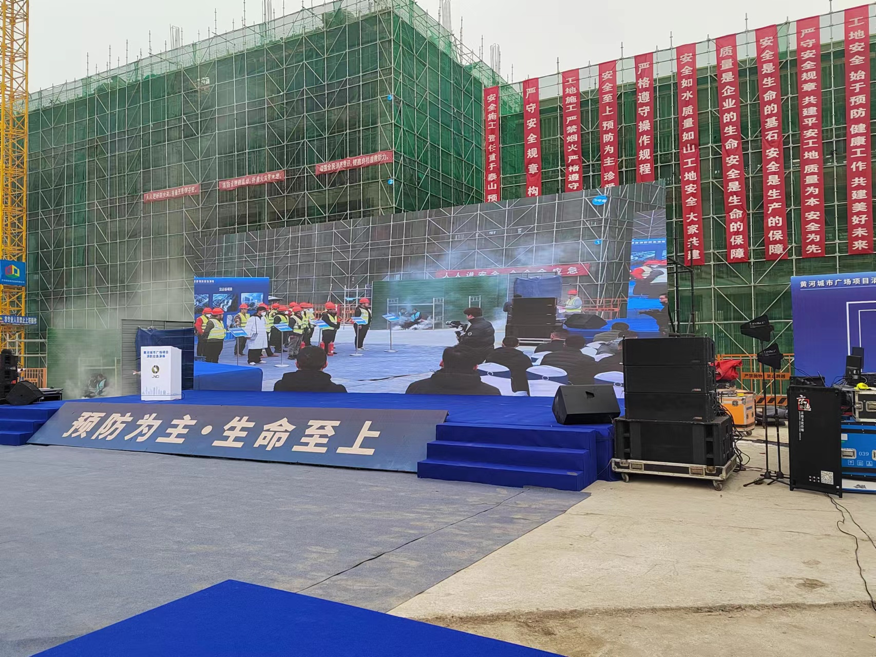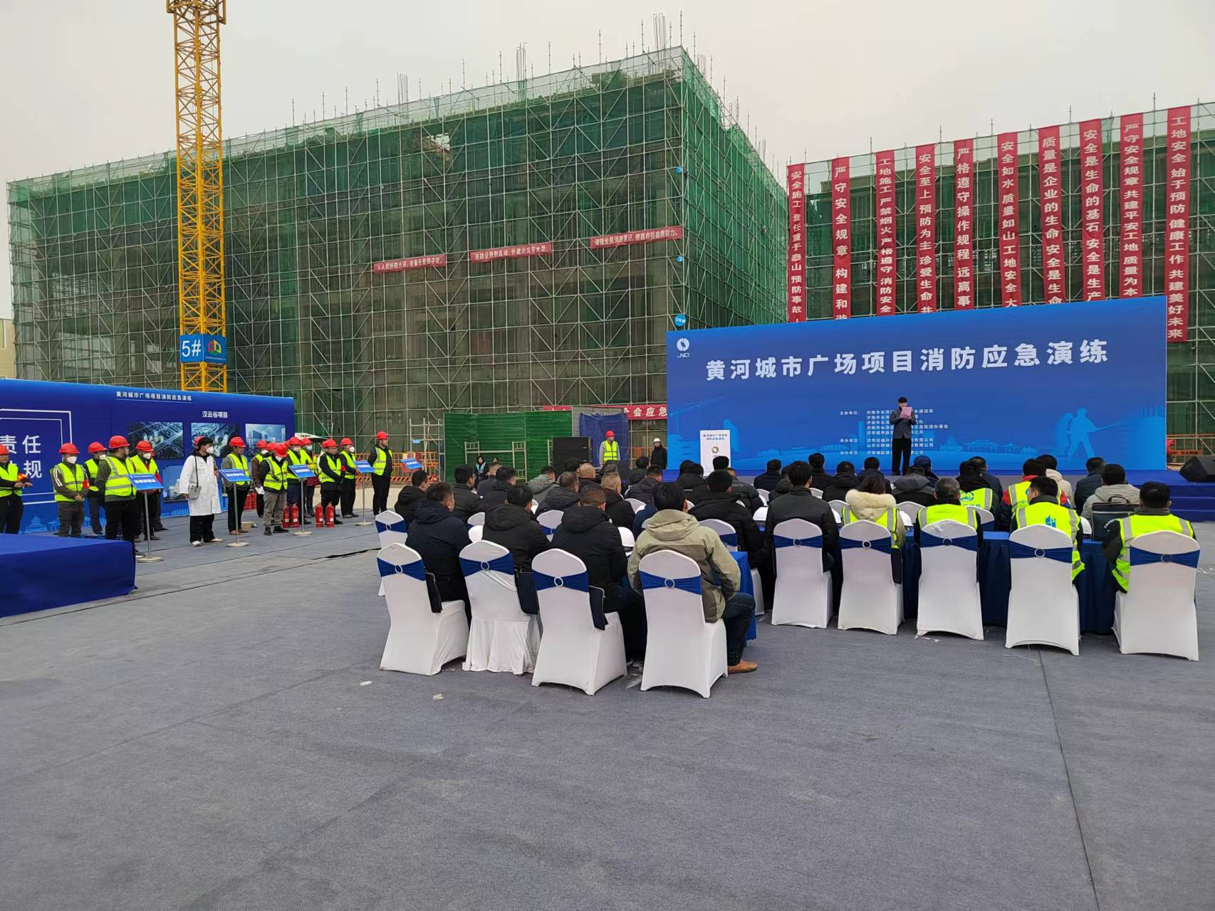 冬季是火災(zāi)多發(fā)季節(jié),為進(jìn)一步加強(qiáng)安全生產(chǎn)工作,有效預(yù)防突發(fā)火災(zāi)事件,提高處理突發(fā)事故的應(yīng)急處置能力,確保項(xiàng)目參建人員人身安全及項(xiàng)目建設(shè)順利實(shí)施,12月27日,由濟(jì)南舊城開發(fā)投資集團(tuán)有限公司主辦,濟(jì)南城投建設(shè)發(fā)展有限公司承辦的大型消防應(yīng)急實(shí)戰(zhàn)演練活動在黃河城市廣場建設(shè)項(xiàng)目舉行,長清區(qū)住房和城鄉(xiāng)建設(shè)局、長清區(qū)應(yīng)急管理局、長清區(qū)消防救援大隊(duì)、長清區(qū)文昌街道辦事處、城投集團(tuán)安全應(yīng)急管理辦公室、濟(jì)南舊城開發(fā)投資集團(tuán)有限公司、山東樂耕城市建設(shè)開發(fā)有限公司主要負(fù)責(zé)同志及濟(jì)南舊城開發(fā)投資集團(tuán)在建項(xiàng)目總包單位、監(jiān)理單位相關(guān)人員參加演練活動。
